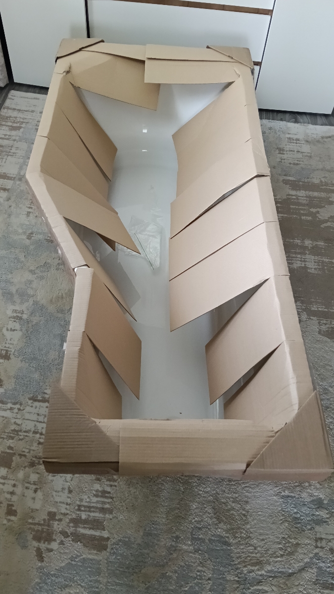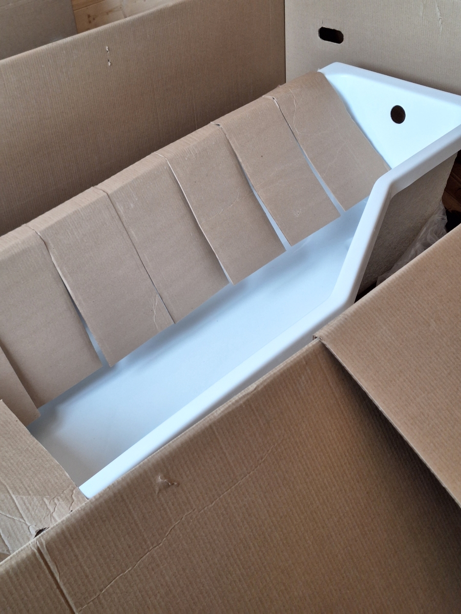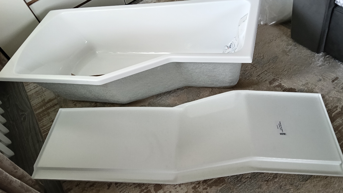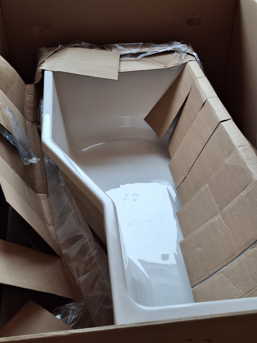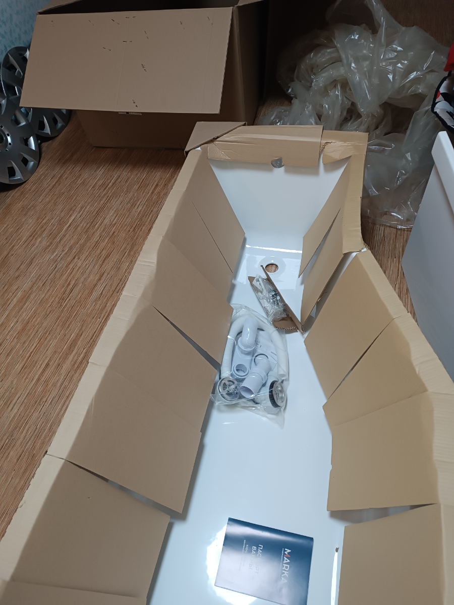 насколько удалось посмотреть ванну вроде все цело, комплектация полная, коробка была настолько большая что еле вошла в проём высота коробки с человека ростом,экран в коробке на ней ванна и все это еще в коробке,не удобно распаковывать, все пришлось частями снимать и вынести на помойку, тк негде это хранить, ванну распечатали ,пока не поставили
