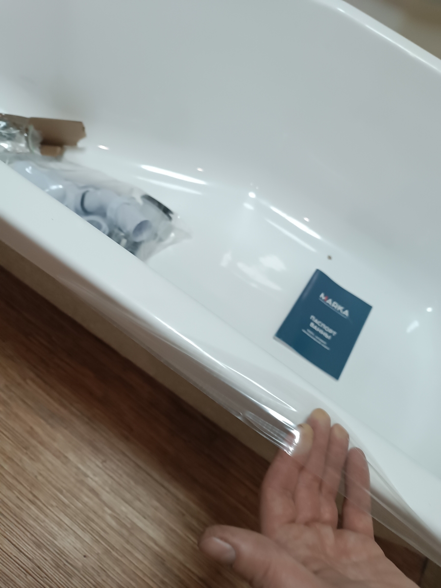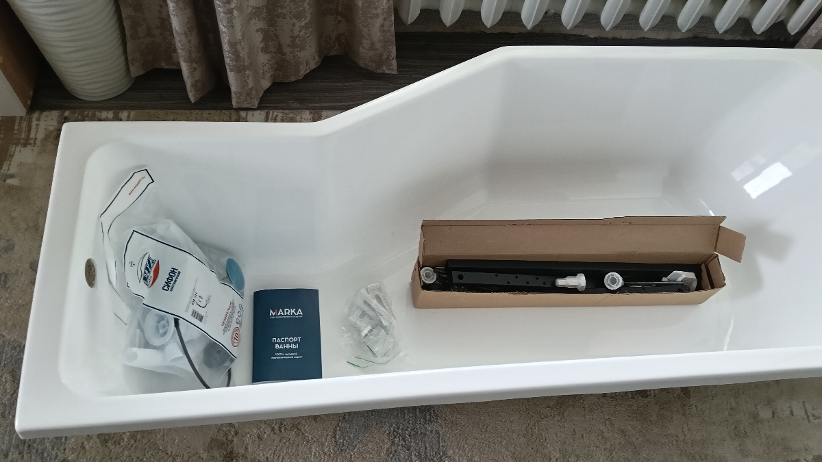 еще не установили, но выглядит крепкой. Будем ставит на каркас, хоть и пишут, что ставится просто на ножки. Приехала в гигантской коробке, как из под двух холодильников, вроде уцелела в дороге. Печально, что нельзя взять набором без слива/перелива и без ног.(только ванна и экран). Подходящего по форме карниза на озоне для ванны длиной 170 нет, на сайте стоит больше 6тр. Так что обойдемся, думаю прямым.