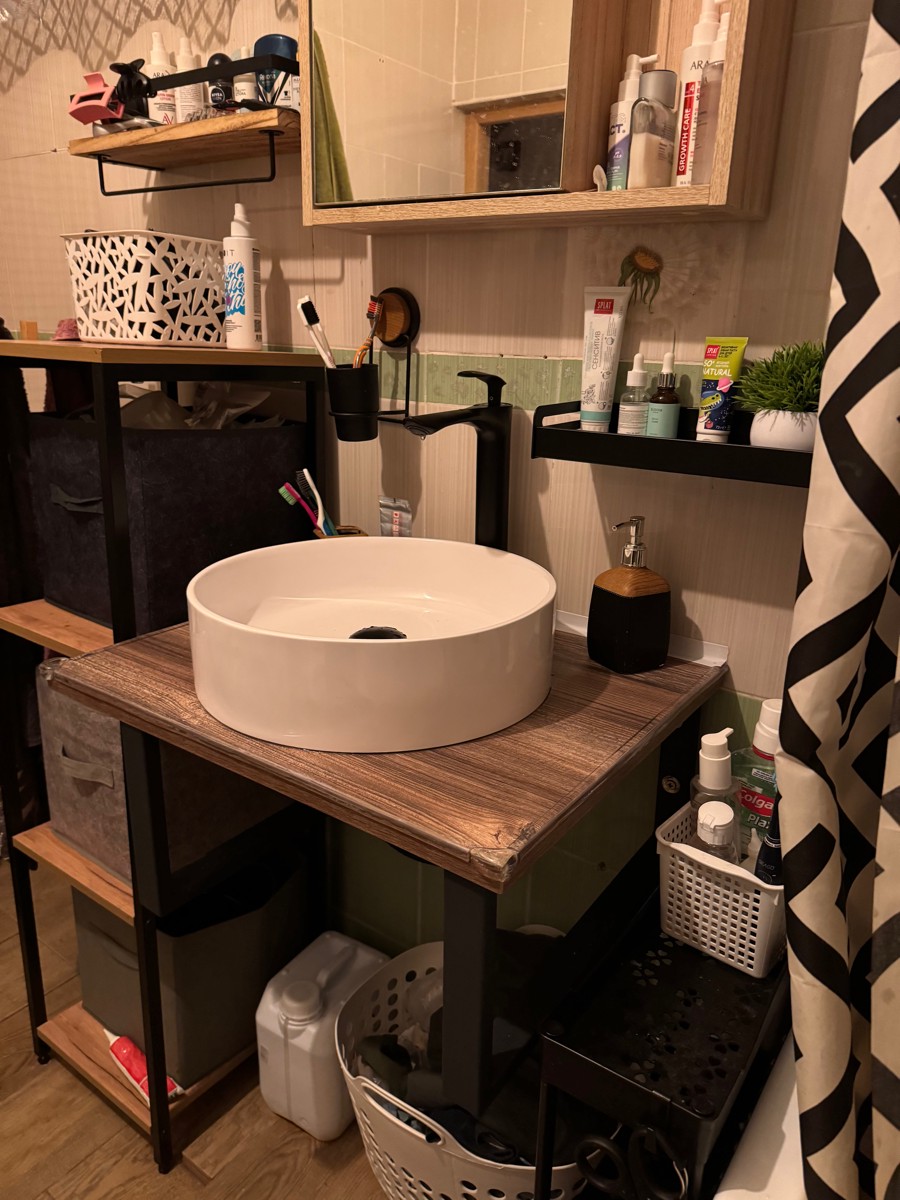 Деревянная столешница под раковину в ванную в стиле лофт - нестандартное компактное решение для современного интерьера. Сочетание холодного оттенка дерева и металла вносит эффект новизны в привычный дизайн ванной комнаты.