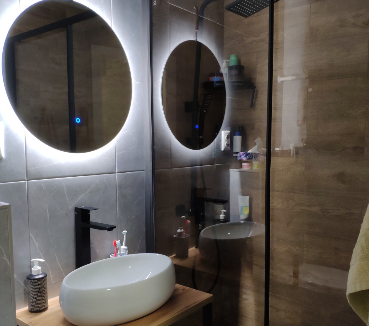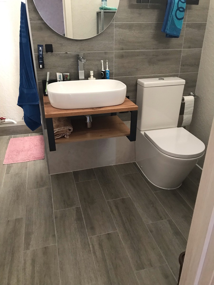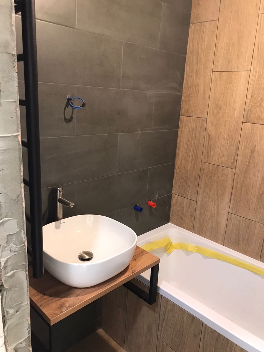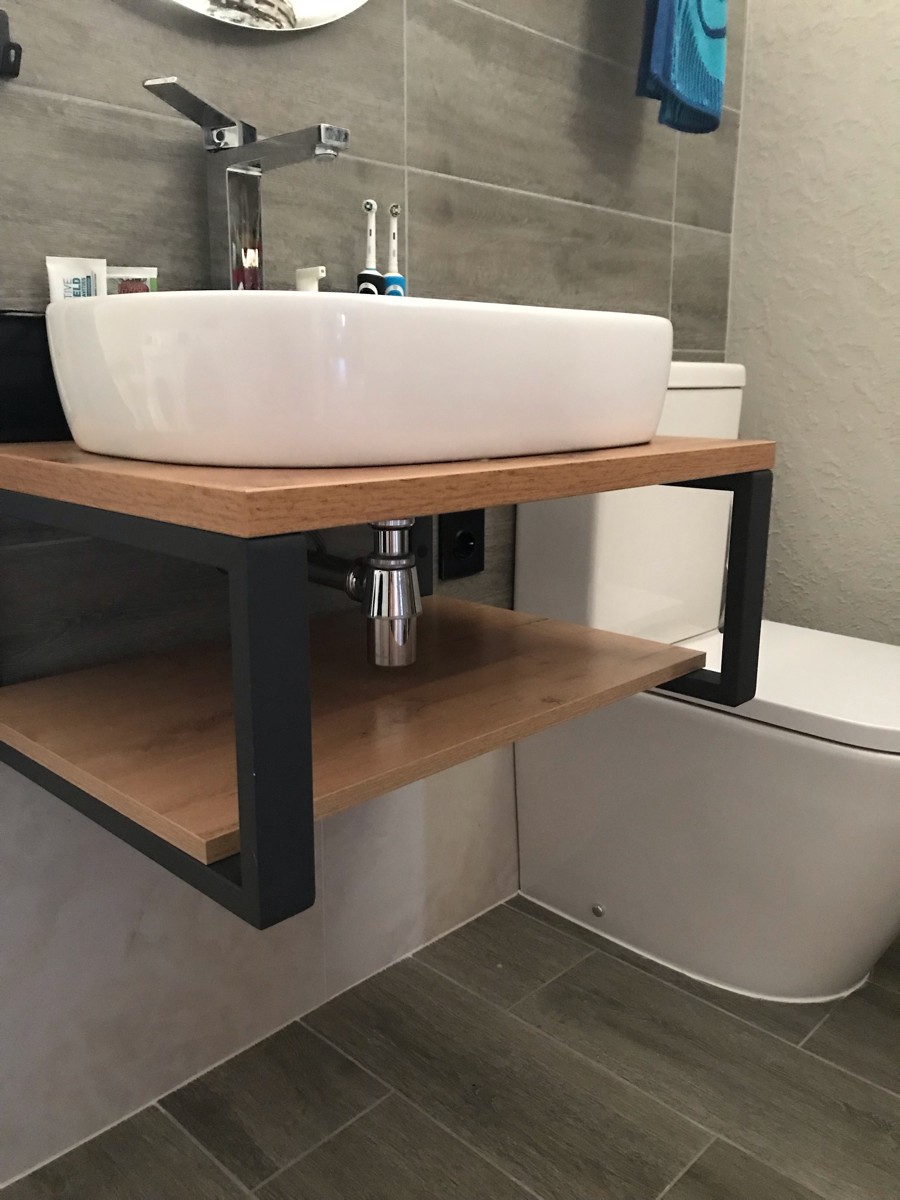 Деревянная столешница под раковину в ванную в стиле лофт - нестандартное компактное решение для современного интерьера. Сочетание дерева и металла вносит эффект новизны в привычный дизайн ванной комнаты.