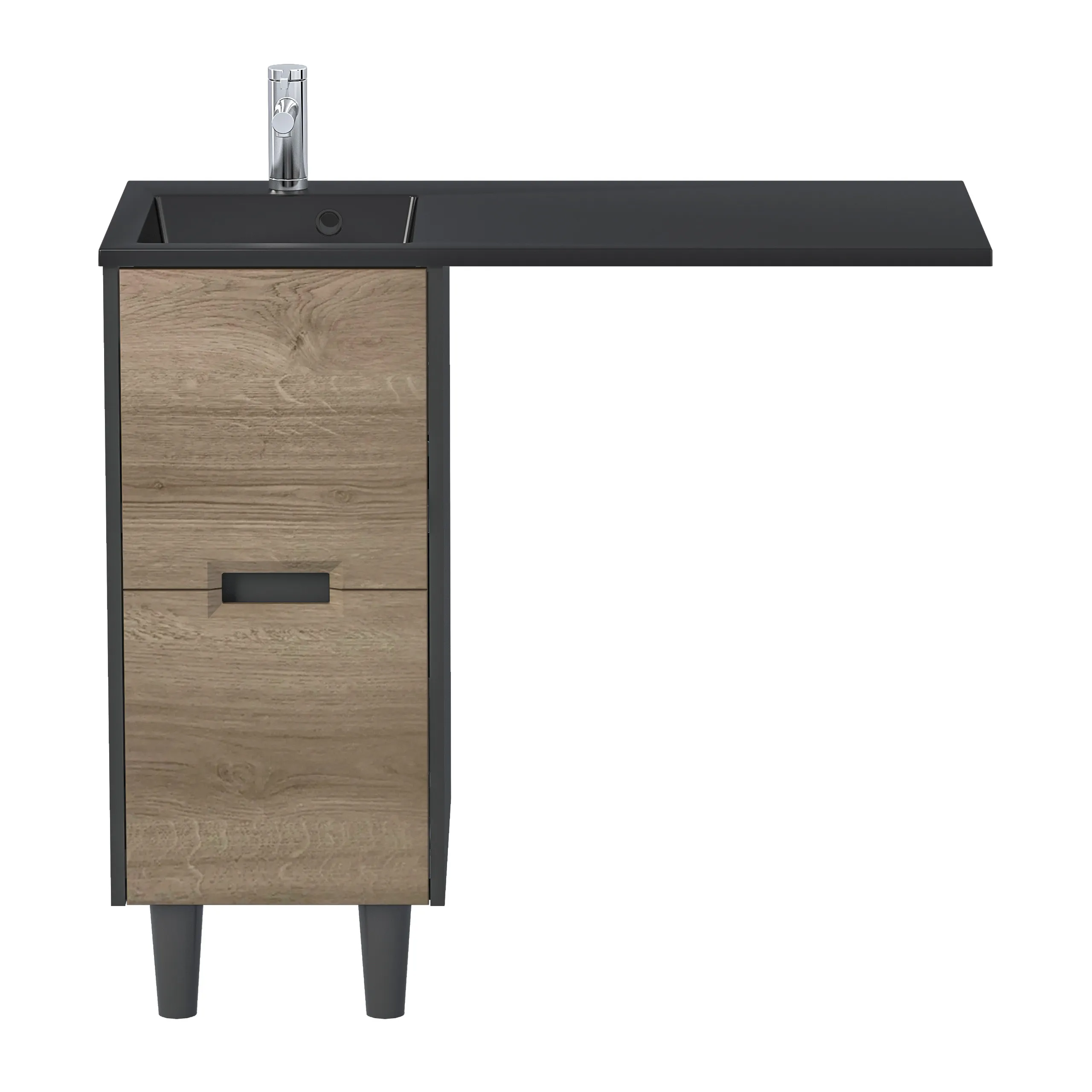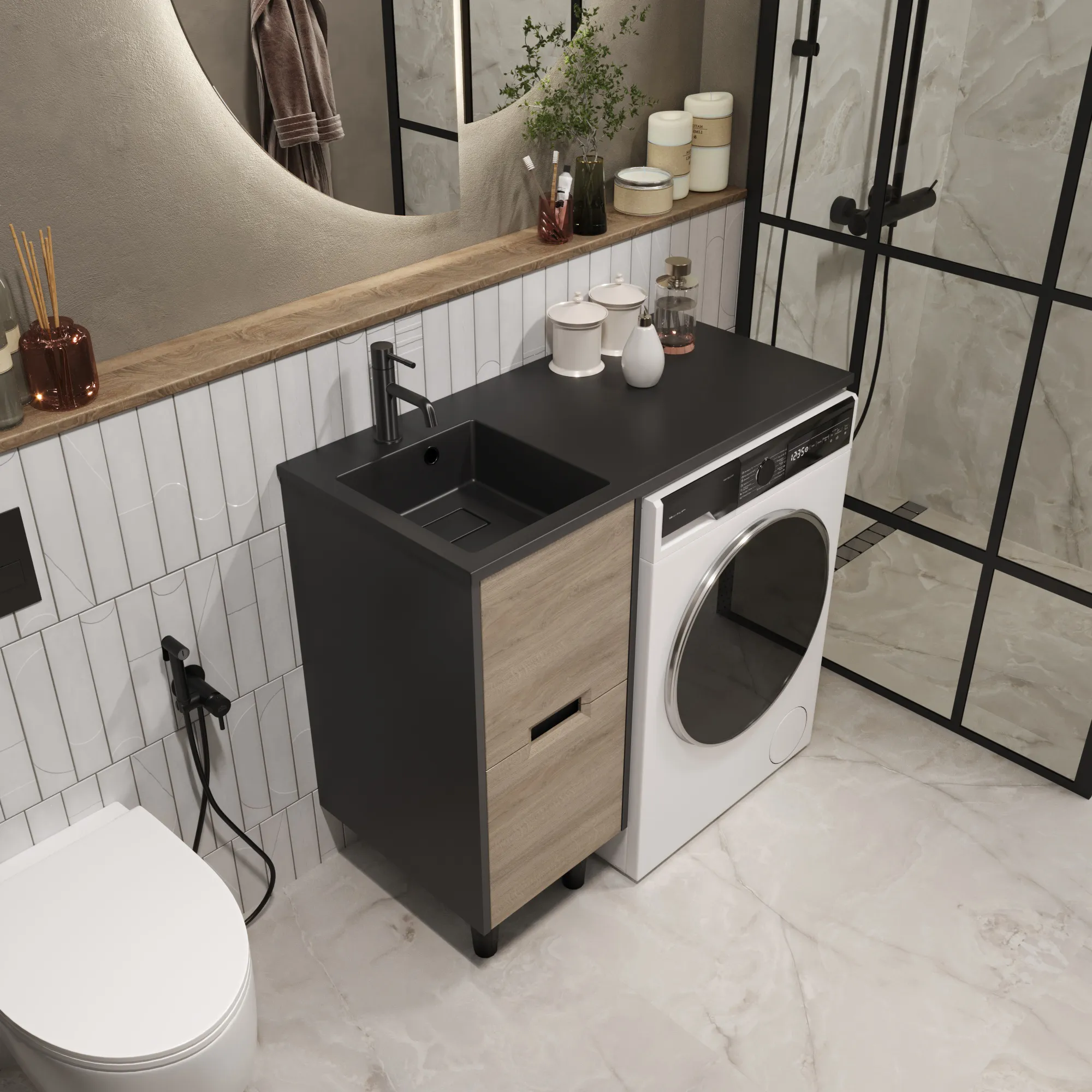 умба под раковину* и стиральную машину Maid – элегантное и функциональное решение, она создает гармоничное пространство в ванной комнате. Искусное сочетание антрацита и "ореха лучистого европейского" придает тумбе изысканный вид, а два вместительных ящика помогут легко организовать порядок. Акцентные опоры черного цвета гармонично дополнят ваш выбор: строгая графитовая или нежная белая раковина – для создания неповторимого стиля ванной комнаты.