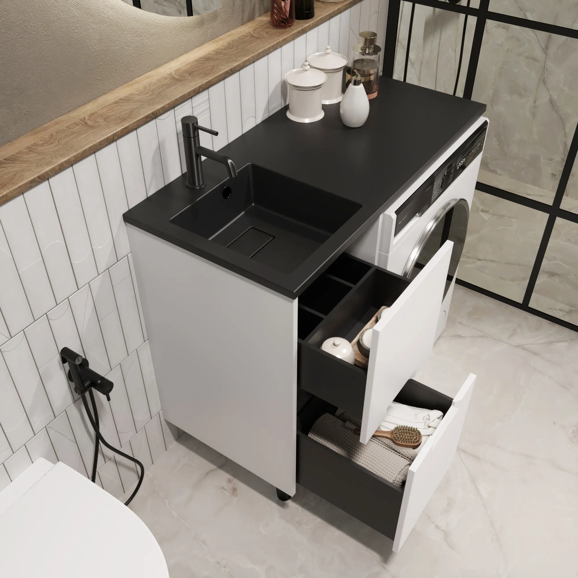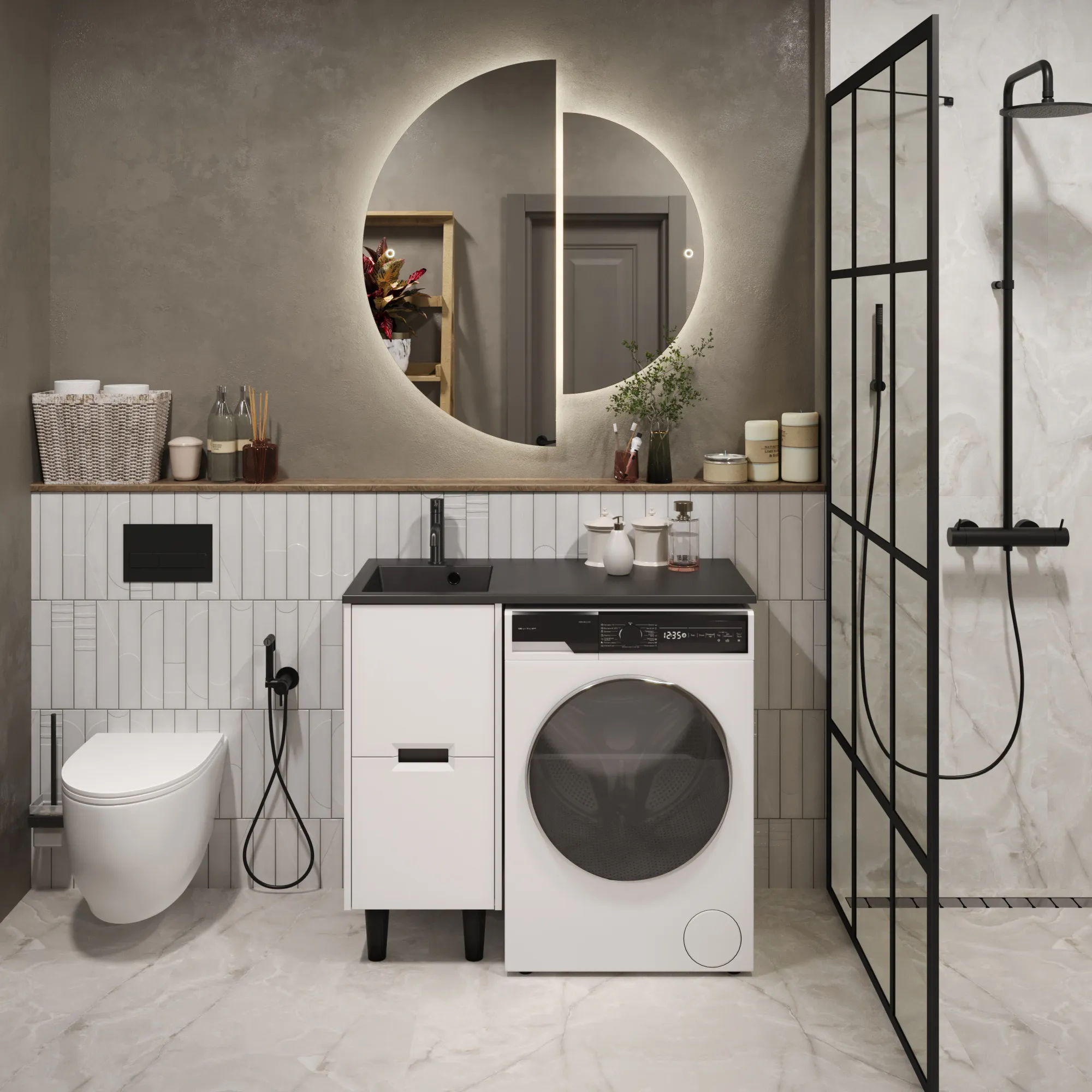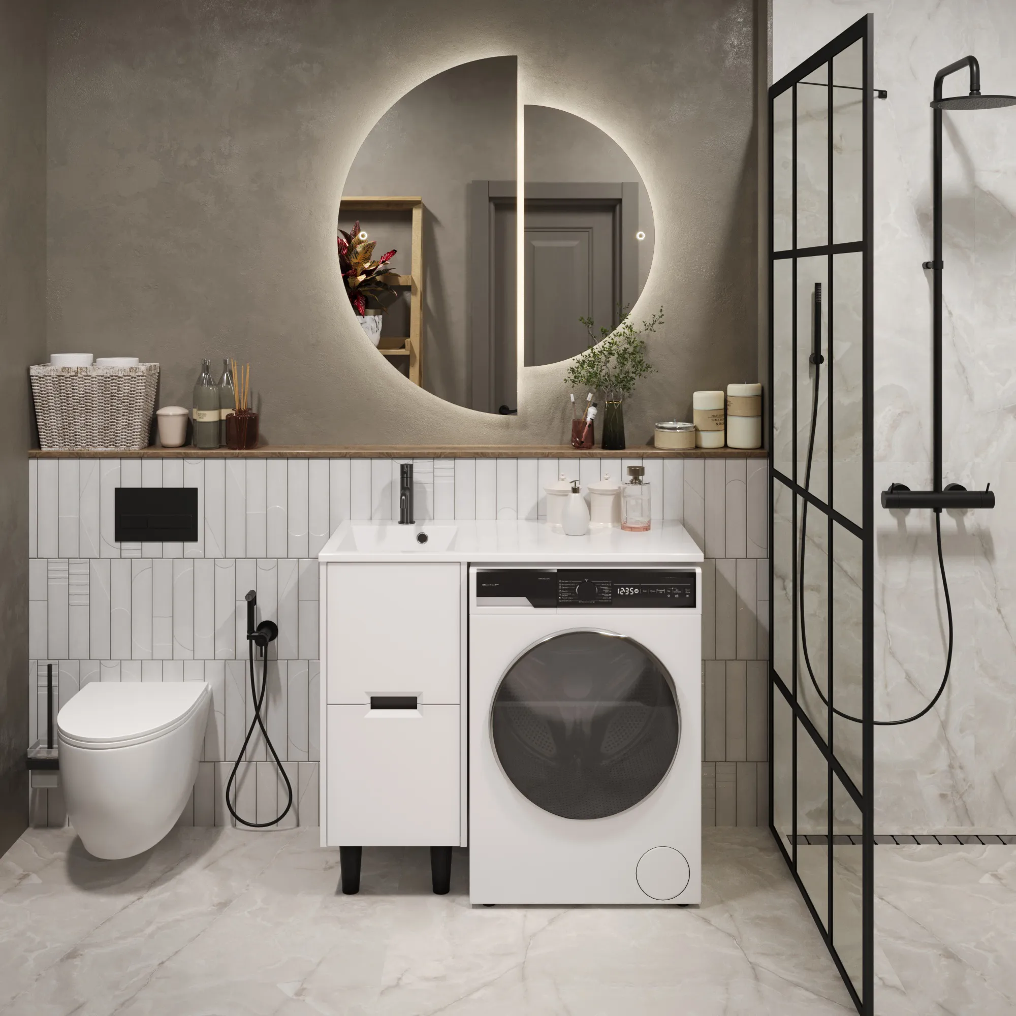 Тумба под раковину* Maid – элегантное решение "2-в-1", которое объединяет функциональность и стиль, позволяя гармонично разместить раковину и стиральную машину в ванной комнате. Белый цвет легко сочетается с другими цветами и стилями интерьера, предоставляя свободу в оформлении ванной комнаты. Акцентные опоры черного цвета гармонично дополнят ваш выбор: строгая графитовая или нежная белая раковина – для создания неповторимого стиля ванной комнаты.
