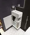 Компактная мебель с уникальными габаритами - глубина тумбы всего 30 см. Мебель выполнена в современном минималистичном стиле, для которого характерны правильные геометрические формы, рациональность и эргономичность. Специально продуманная конструкция без ручек позволяет создать цельный легкий образ, не утяжеленный фурнитурой и дает возможность гармонично вписаться в любой интерьер. Для бережливой повседневной эксплуатации, тумбы оснащены демпферами и дверными петлями с доводчиками, обеспечивающими бесшумное и мягкое закрывание. В комплекте идет раковина из полимерной керамики. Решение идеально подойдет в гостевой санузел или маленькую ванную.