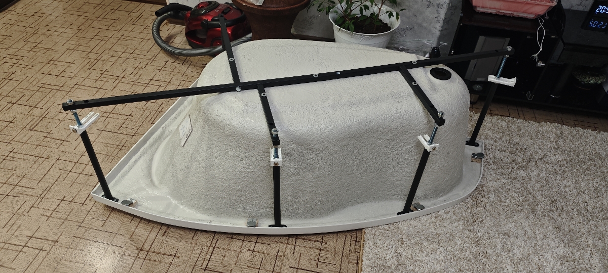 Крепкая ванна, не маленькая, вполне удобная. Испытали трудности со сборкой, картинка в инструкции не соответствует виду деталей, не сказано, что гайки для передней панели должны устанавливаться сразу, пришлось выкручивать 2 крайние опоры, чтобы добавить гайки крепежа панели. Можно было бы удобней установить верхний держатель панели в закладную при сборке каркаса. Не хватает описания последовательности сборки, видео не достаточно. Совет: начинайте регулировку по центральной и угловой ножкам, лазерный уровень в помощь.