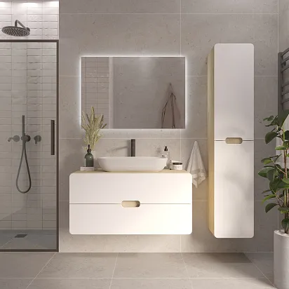 • Подвесной тип крепления облегчает уборку и визуально расширяет пространство. Интегрированные ручки становятся стильным дополнением пенала.