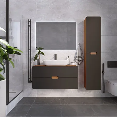 Черный подвесной пенал - современное минималистичное решение для ванной. Плавные скругленные углы символизируют гармонию, создают ощущение легкости и безопасности. Это особенно актуально в ванной комнате, где важно чувствовать себя комфортно и расслабленно. Черный фасад придает мебели строгость, в то время как древесный ореховый корпус добавляет теплоты и натуральности. Такое сочетание создает контрастный и изысканный интерьер, который подчеркивает индивидуальность комнаты.