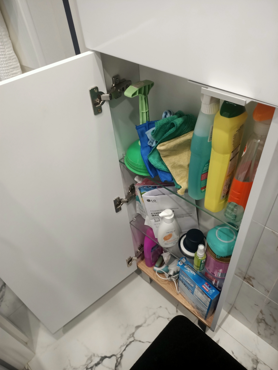 Хорошо вписался в интерьер,вместительный,все убрала с полок.Очень довольна