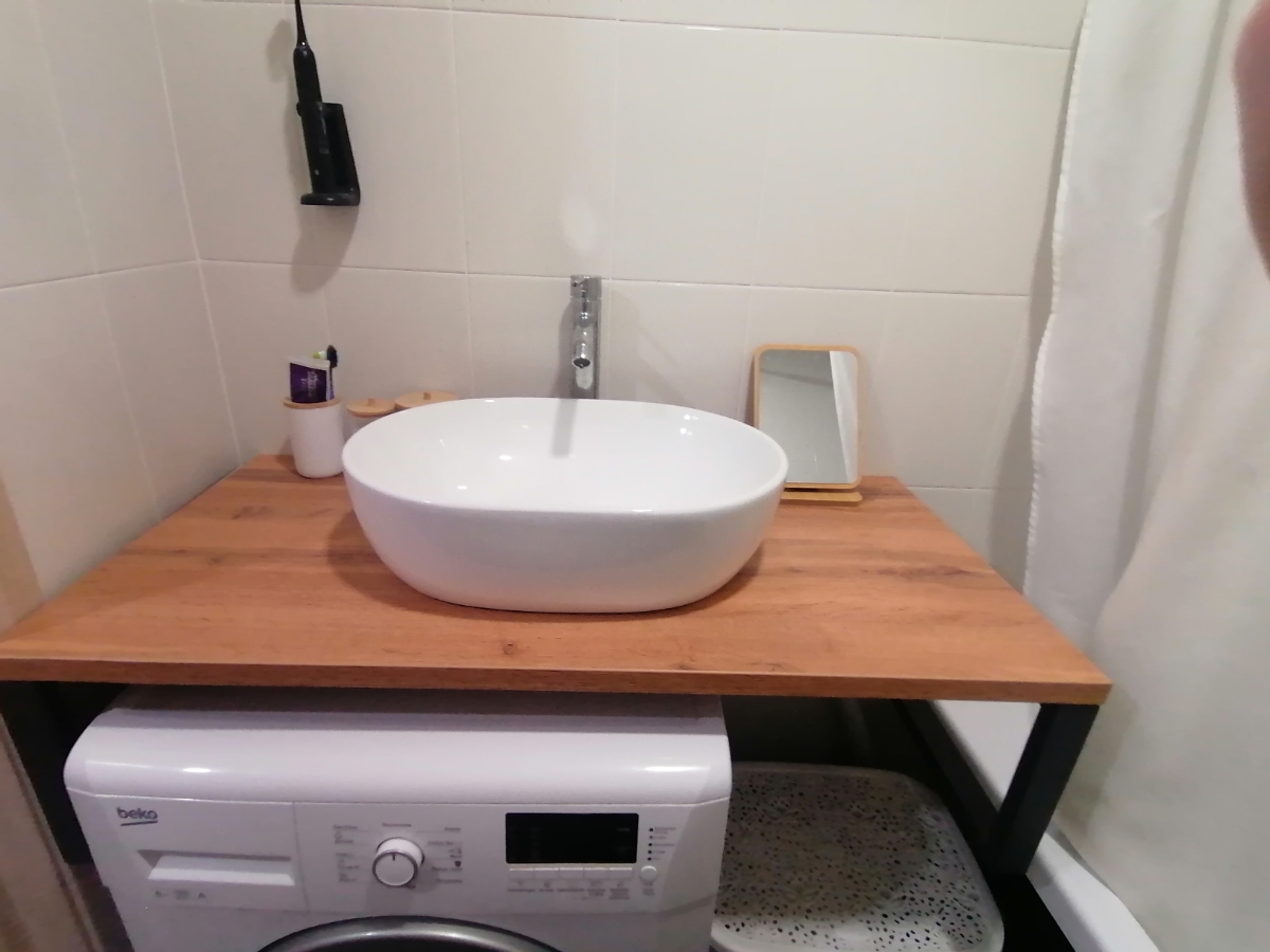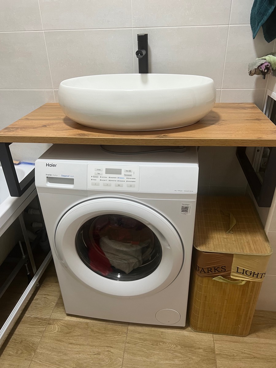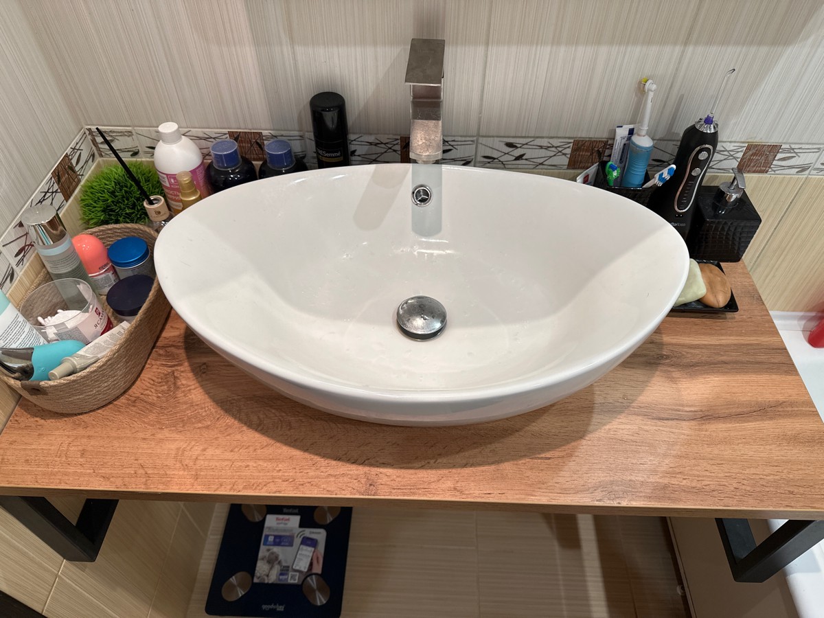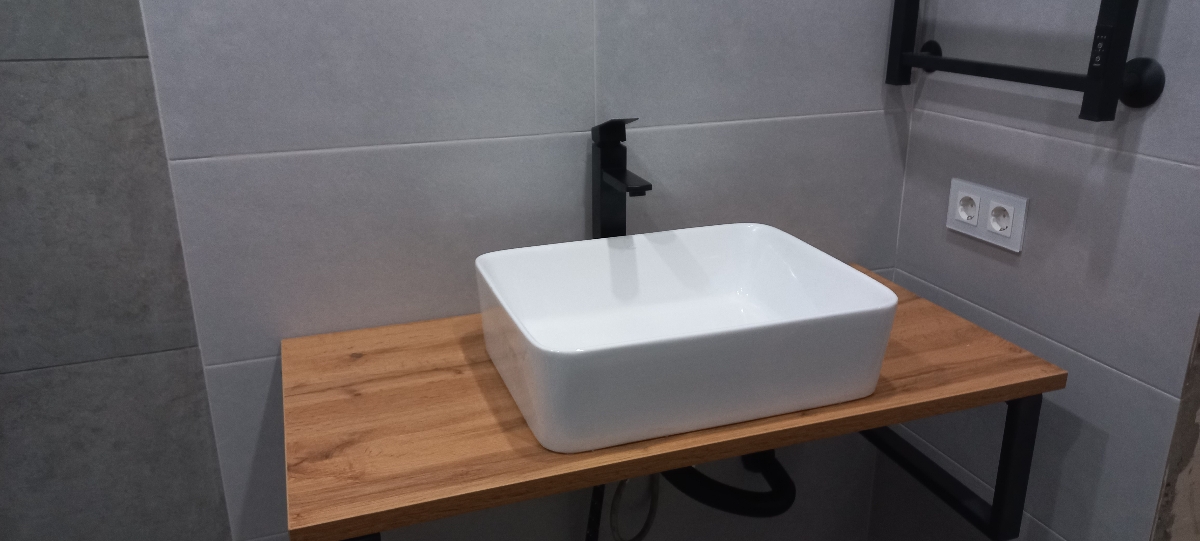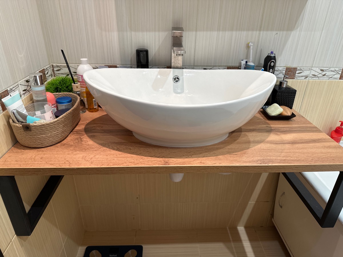 В комплекте были кронштейны, столешница красиво смотрится с накладной раковиной)