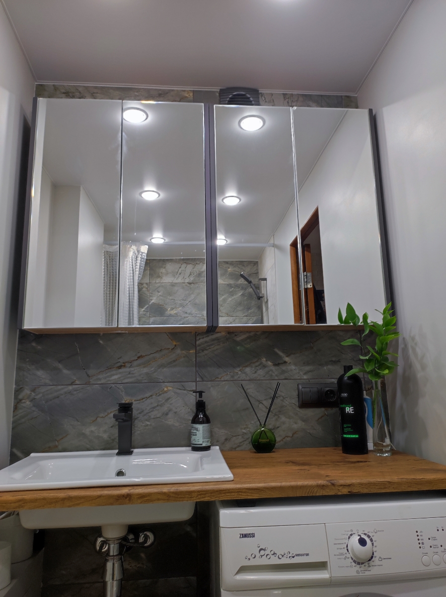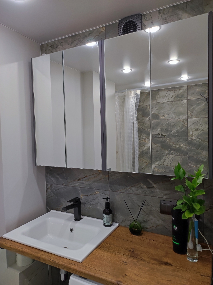 Ещё не установили, поэтому без фото. Зеркало пришло хорошо упаковано. Мне понравились ручки, не надо руками касаться самого зеркала. Глубина идеально подошла к узкой раковине. Купили всю серию в ванную. Цвет темно-серый. Рекомендую